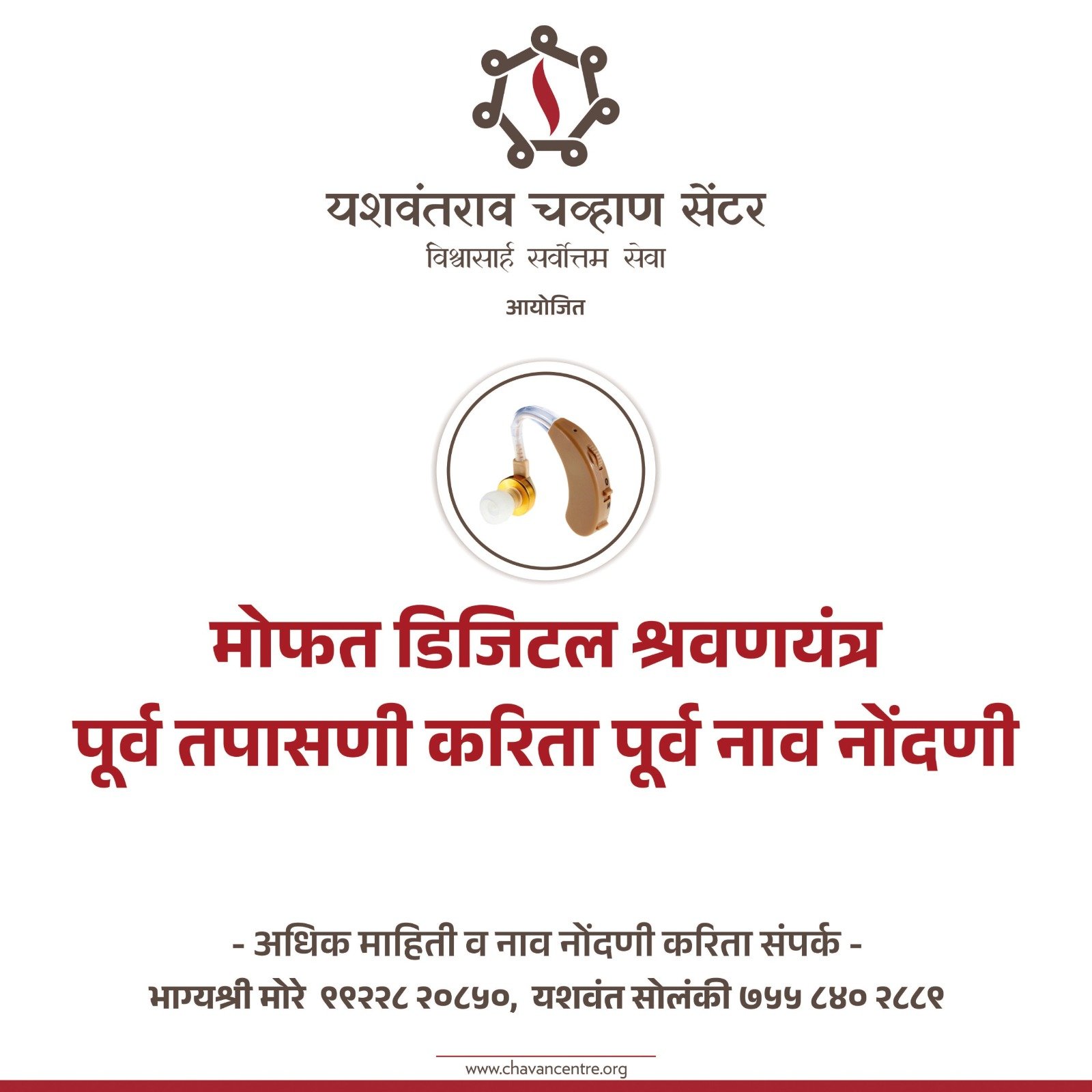 यशवंतराव चव्हाण सेंटर यांच्या वतीने पुणे जिल्ह्यातील कर्णबधिर मुले, व्यक्ती व ज्येष्ठ नागरिकांसाठी मोफत डिजिटल श्रवणयंत्र पूर्व तपासणी व वाटप शिबिराचे आयोजन करण्यात आले आहे.